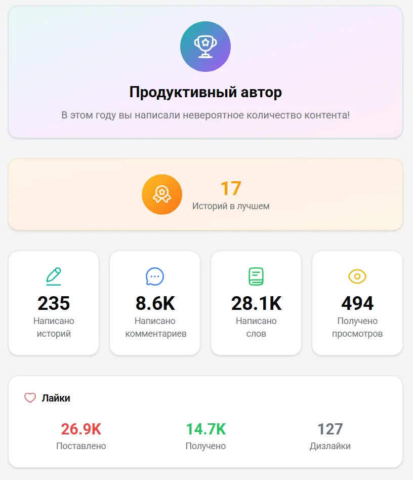 Пусть я на хабе и меньше года, но итоги вполне хорошие. С удовольствием разгружаю фуры лайков в комментах, но был удивлён, что получаю кэшбэком половину назад.