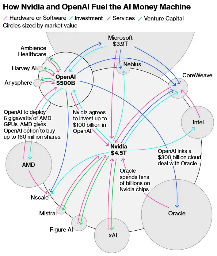 Скептики ИИ давно говорят, что индустрия представляет собой пузырь и с недавними громкими сделками к этому появились новые аргументы. Соглашения между OpenAI, Nvidia, AMD, Intel, Microsoft и другими компаниями зачастую превращаются в круговую передачу средств, где в конечном итоге каждый остаётся при своём, однако воодушевленные инвесторы повышают капитализацию компаний. Одновременно, перспективы монетизации продуктов OpenAI остаются туманными, компания хронически убыточна. Эксперты указывают чт...