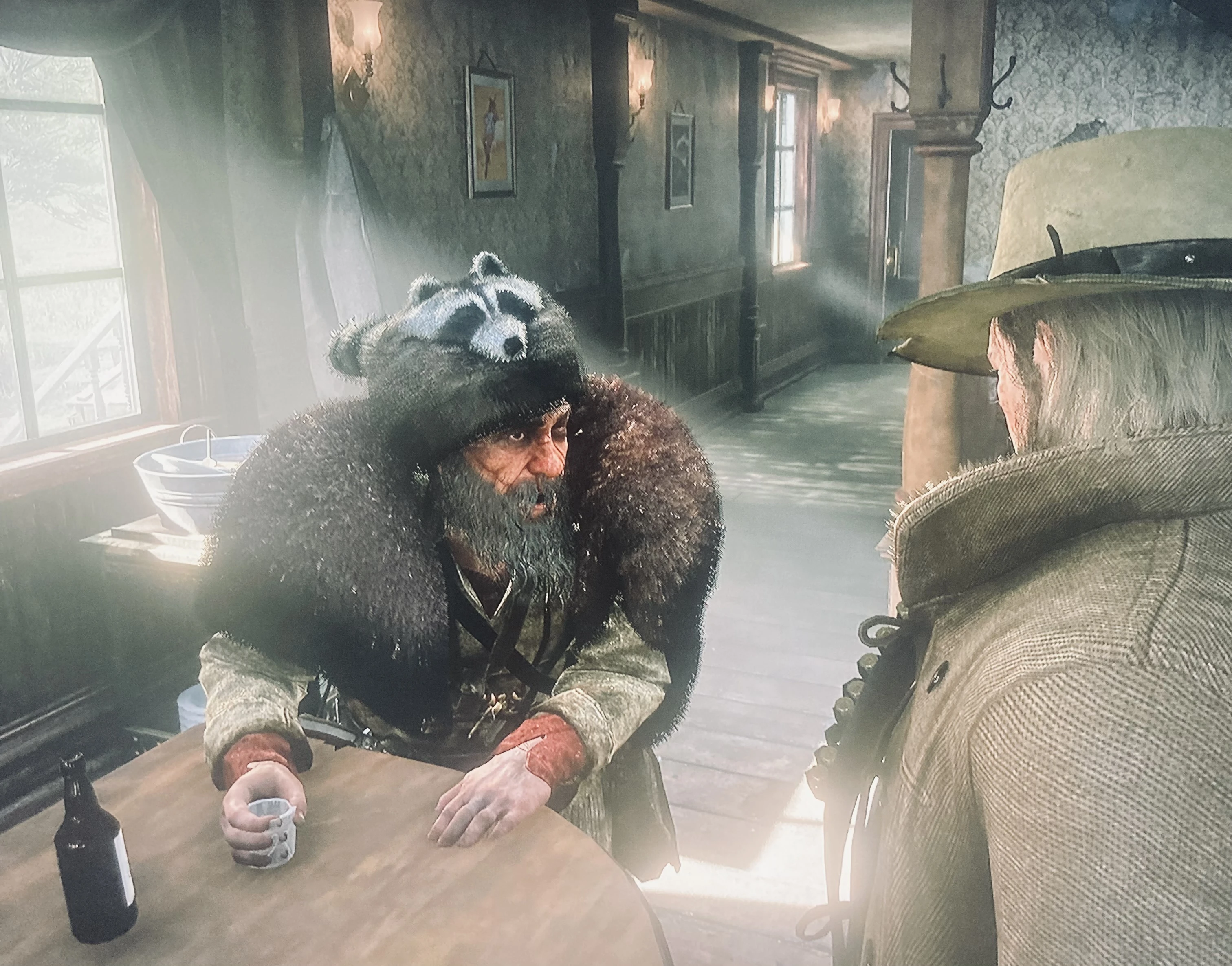 Встретил в местной наливайке колоритного нпс, конечно это не Грут, а Старина Джонс из Валентайна, отмечающий пятницу, и рассказывающий просто фантастическую байку про голод и чуть отвратительный способ борьбы с голодом. В общем нпс наелся и теперь утоляет жажду и разгоняет тоску