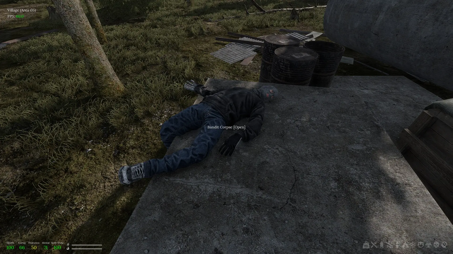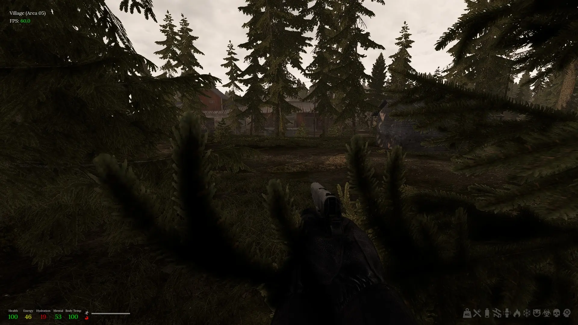 То, что мне, казуалу, здесь будет больно, я понял сразу, как увидел значки состояния – их оказалось ажно 11 штук. Пистоль из инвентаря – почтенный ветеран, Кольт 1911 – отказался перезаряжаться, хотя патроны у меня были. Оказалось, их из коробки надо вначале нафасовать в магазин, а уж потом пристраивать его! Неудивительно, что моя первая вылазка завершилась на третьем бандите, который пристрелил моего персонажа прежде, чем тот успел в ближайшем поселке все хибары облутать. К счастью, пермадет в этой зоне не действовал. К несчастью, пропал кольт – моё единственное оружие, за две следующих вылазки я не смог собрать комбо: пистолет – магазин – патроны одного вида. Пришлось начать заново.