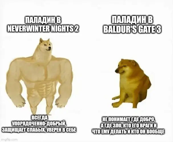 Когда я играл за паладина в neverwinter nights 2 у меня не было проблем с тем, что он может быть только «упорядоченно-добрым». Возможно потому, что я сам тогда, в далёком детстве, был п таким же «упорядоченно-добрым». То есть этот класс мне как родной. Именно поэтому я могу прекрасно играть за паладина в абсолютно любой редакции DND, потому что по сути я отыгрываю в каком-то смысле самого себя. Разве что могу иногда побухтеть как старый дед насчёт паладинов новой редакции «Нынче паладины пошли не те. А вот в наше то вре