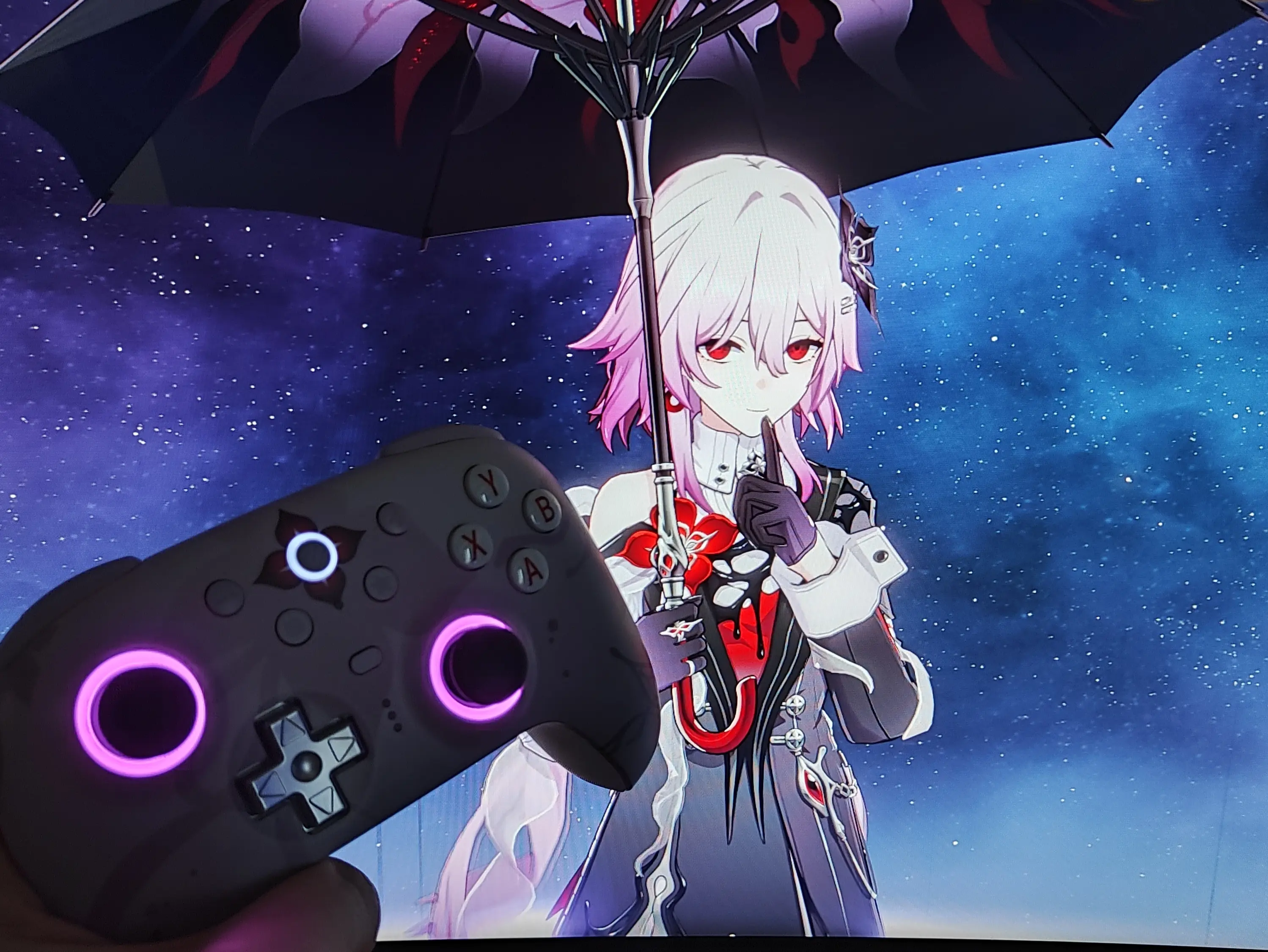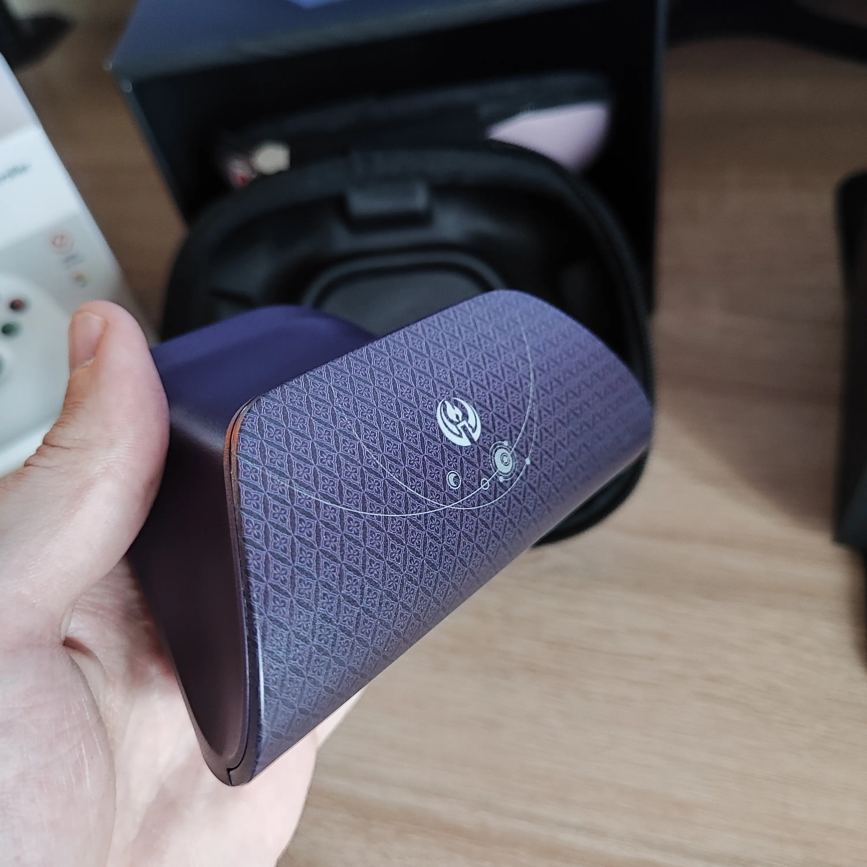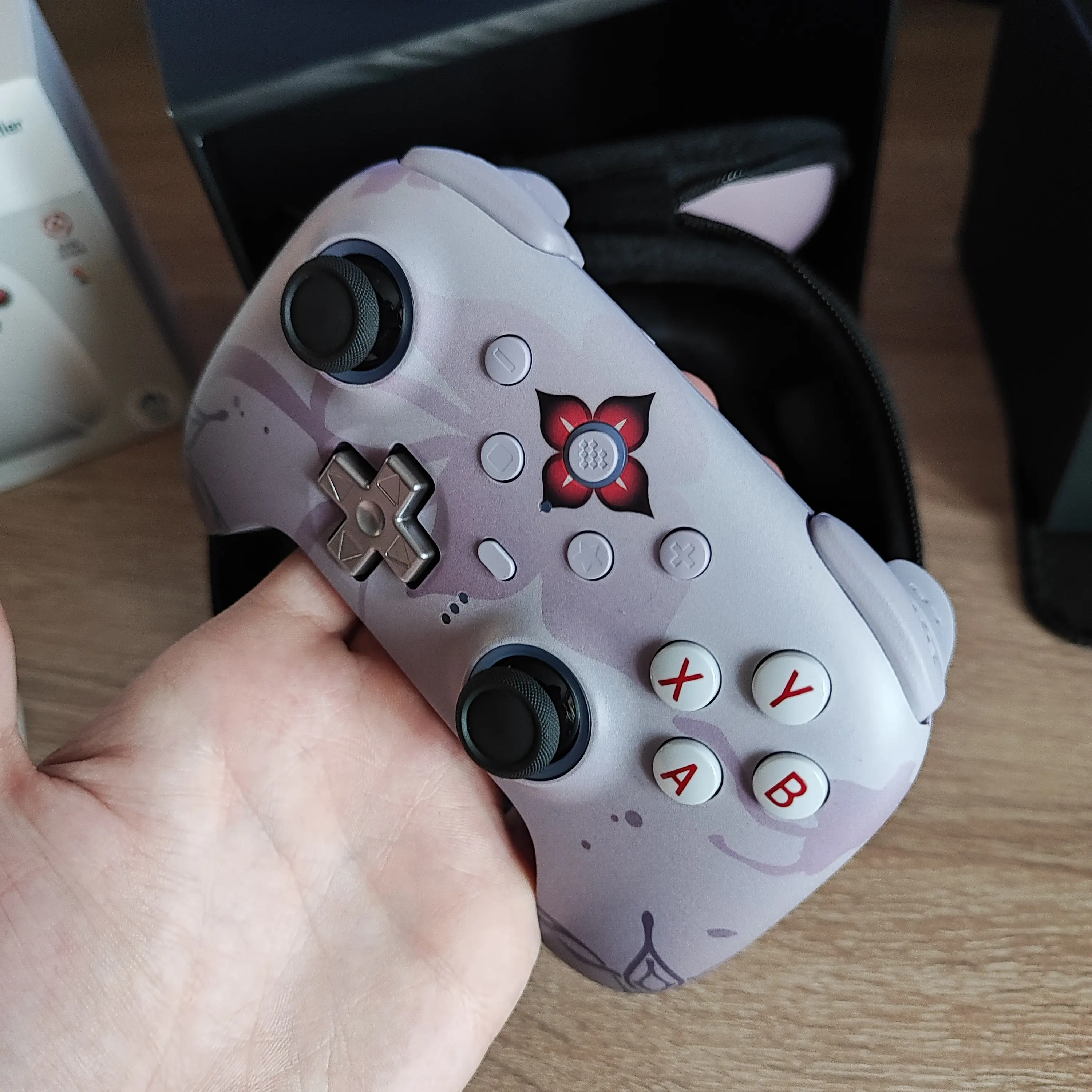 Во-вторых. Он красивый, имхо! Цвет приятный, мякгий, стилизованный минималистичный принт, характерный цветочек в центре, динамическая подсветка в цвет (при желании можно поменять или совсем выключить), которая реагирует на разного рода нажатия. В общем просто и со вкусом. Вполне в духе самого персонажа.