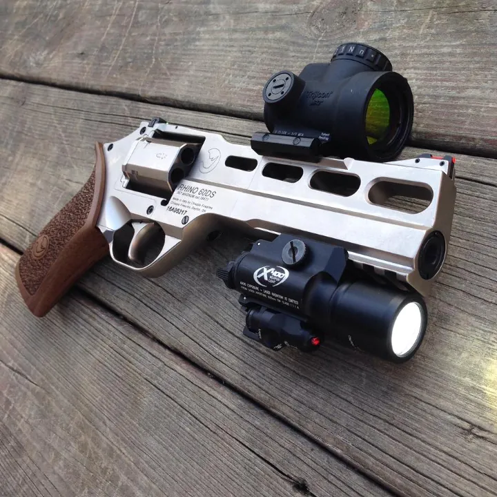 Chiappa разработала свой Rhino в конце нулевых, вывела на рынок в 2010 году и продаёт до сих пор. У револьвера есть широкий набор модификаций с длинной ствола от 2 до 12 дюймов, различными отделками ствола и разными рукоятями. Последнее особенно важно, так как у Rhino специфическая эргономика, для прицеливания необходимо доворачивать кисть, в итоге ствол образует с рукой стрелка почти прямую линию, однако не всякому такой хват удобен.