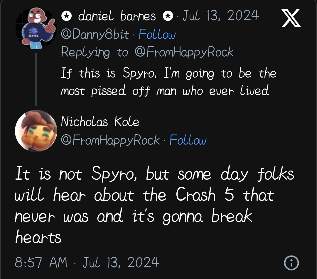 "Это не Spyro, но когда-нибудь люди услышат о Crash 5, которой никогда не было, и это разобьёт сердца", - написал Коул.