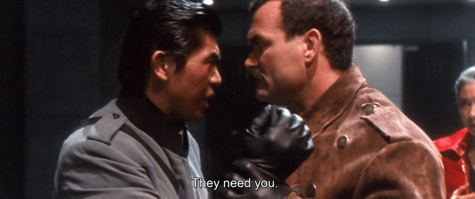 Большая часть фильма - разговоры всяких "широких и важных пиджаков" в различных кабинетах, пока наш гожира сминает Японию, аки бухарь пустую пластиковую бутылку любимого "очаково". Собсна в этом и юмор: пока важные чины сидят по кабинетам и принимают (а потом внезапно отменяют) свои очень неуверенные решения, город и население отправляются "на корм" катастрофе и богам, ненасытным до крови.