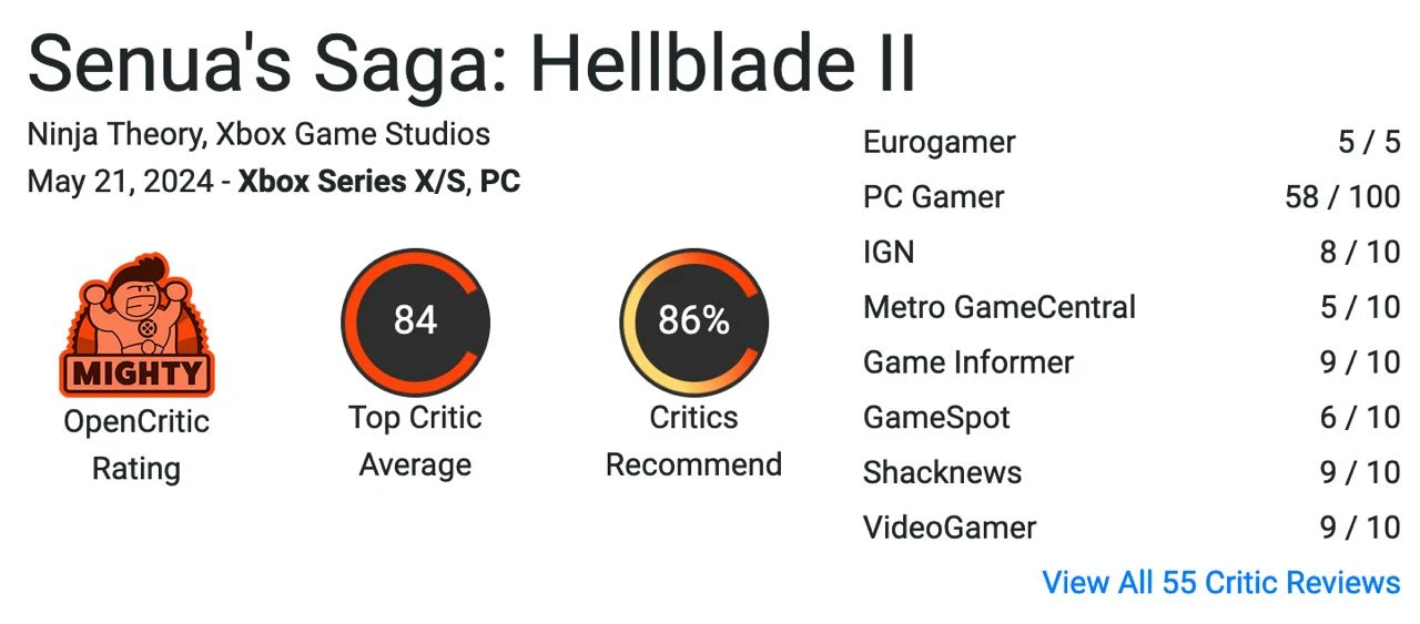 Hellblade II получила высокие оценки от критиков — 84 балла на OpenCritic. В своих обзорах они называют игру "новым уровнем в области иммерсивного повествования". Особенно хвалят графику и погружение в игровой мир.