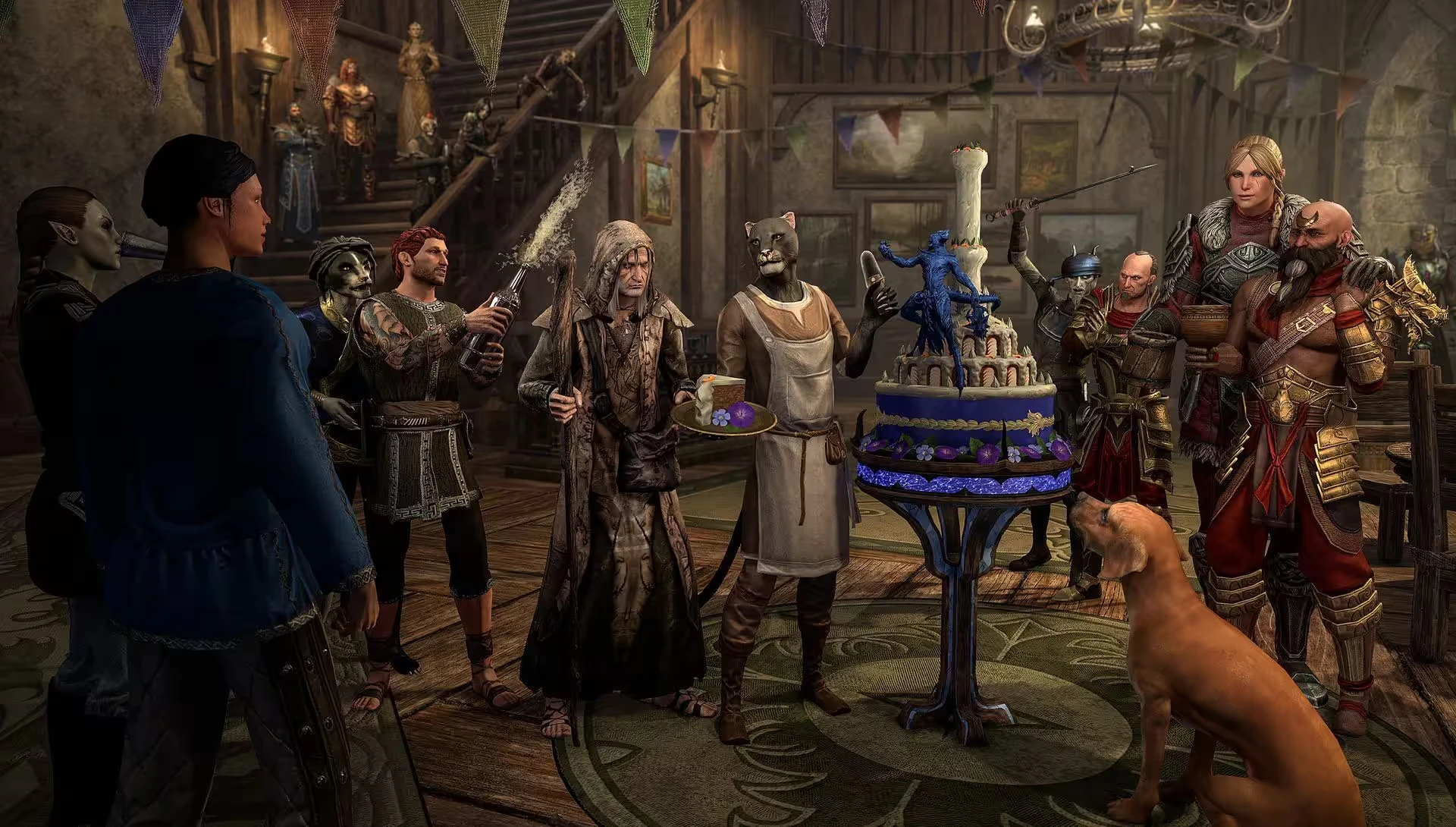 Для начала выполните задание «Ради торта», чтобы получить юбилейный торт этого года, который можно получить у молодого каджита-повара Ученика Мога рядом с доками Стража Вулхела, Дозора Давона и Даггерфолла, или бесплатно в разделе «Событие» во внутриигровом кронном магазине.