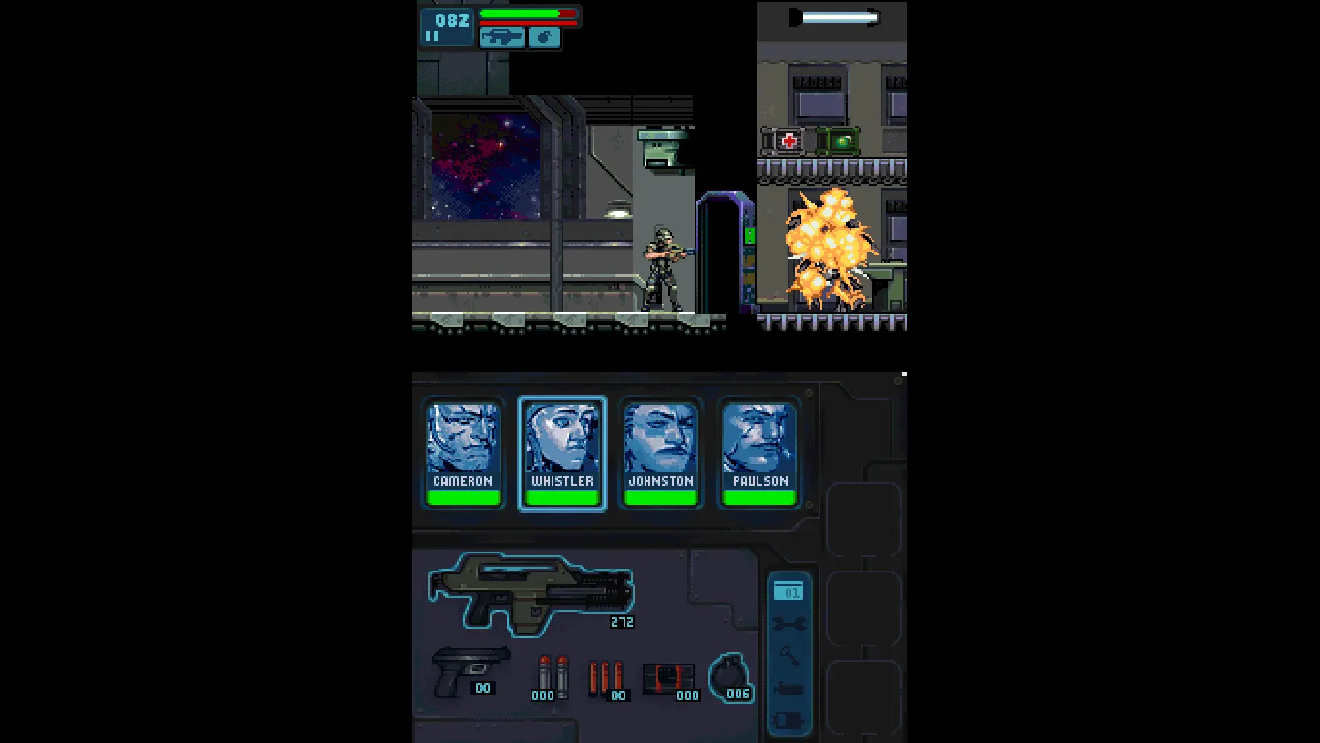 Мне ещё очень далеко до того, чтобы как-либо уверенно ориентироваться среди всего, что клепало на своём веку "Нинтендо", но как я понимаю, Nintendo DS это некая портативка, что помимо стандартных кнопок имела два экрана и стилус для цифрового с ними взаимодействия. Концепция не лишённая смысла и Aliens: Infestation вписывается в такие рамки довольно органично. Игра вообще выглядит весьма привлекательно — это та самая игра, в которую ты всей душой жаждешь поиграть, посмотрев фильм Кэмерона. Узнаваемая атрибутика, симпатичная графика, простой, но многофункциональный геймплей c возможностью переключаться между пушками, простая и надёжная форма коридорного экшена — что могло пойти не так?
