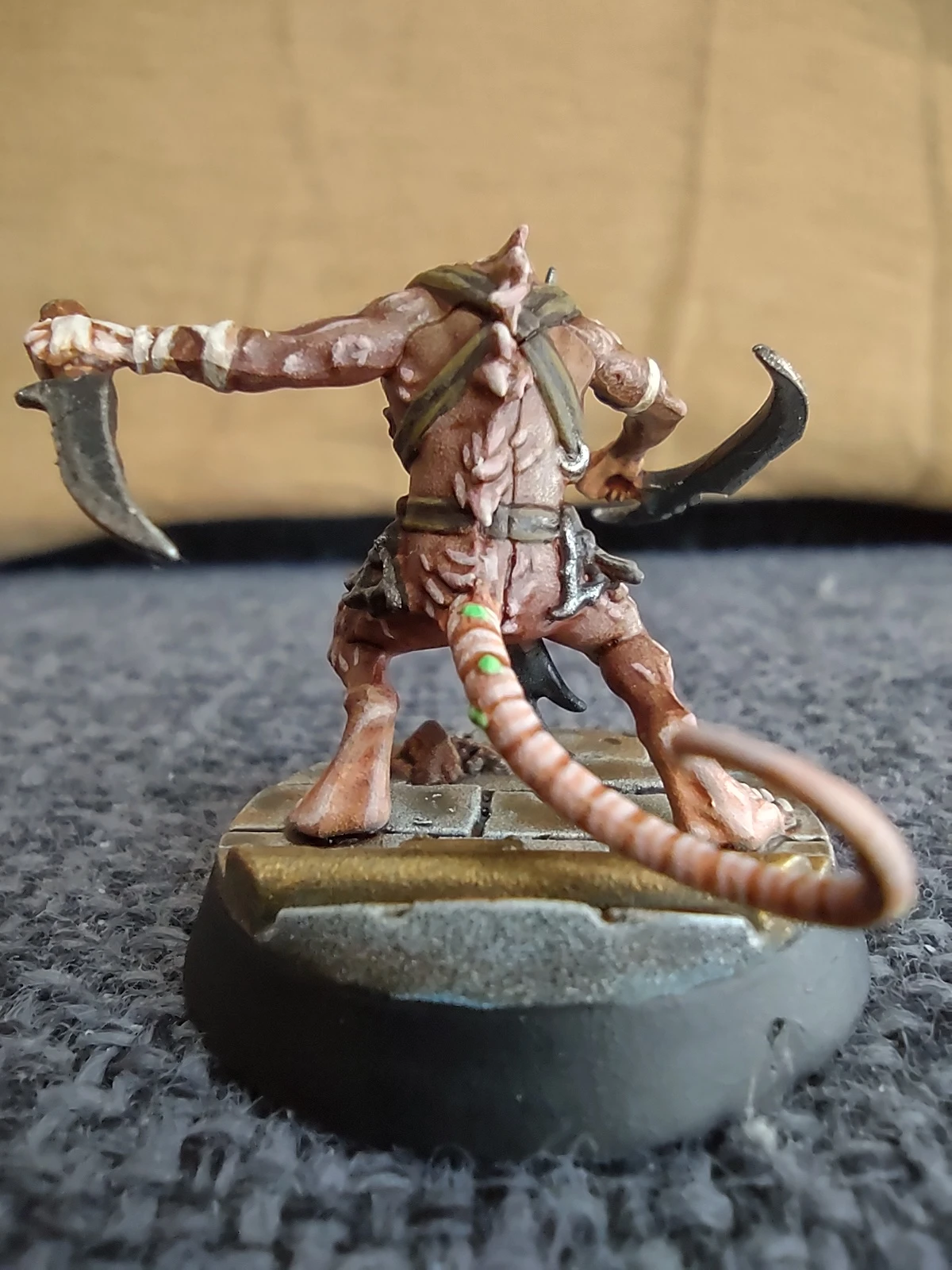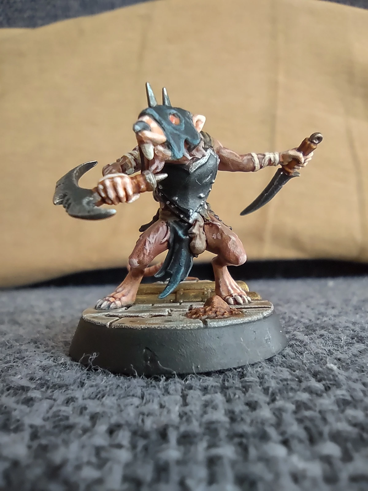 Следующим пошел второй мелкий крысюк, с парными клинками. С ним я попробовал другую цветовую схему для шерсти и кожи, ИМХО куда более интересно выглядящую. Также немного по иному сделал его оружие.