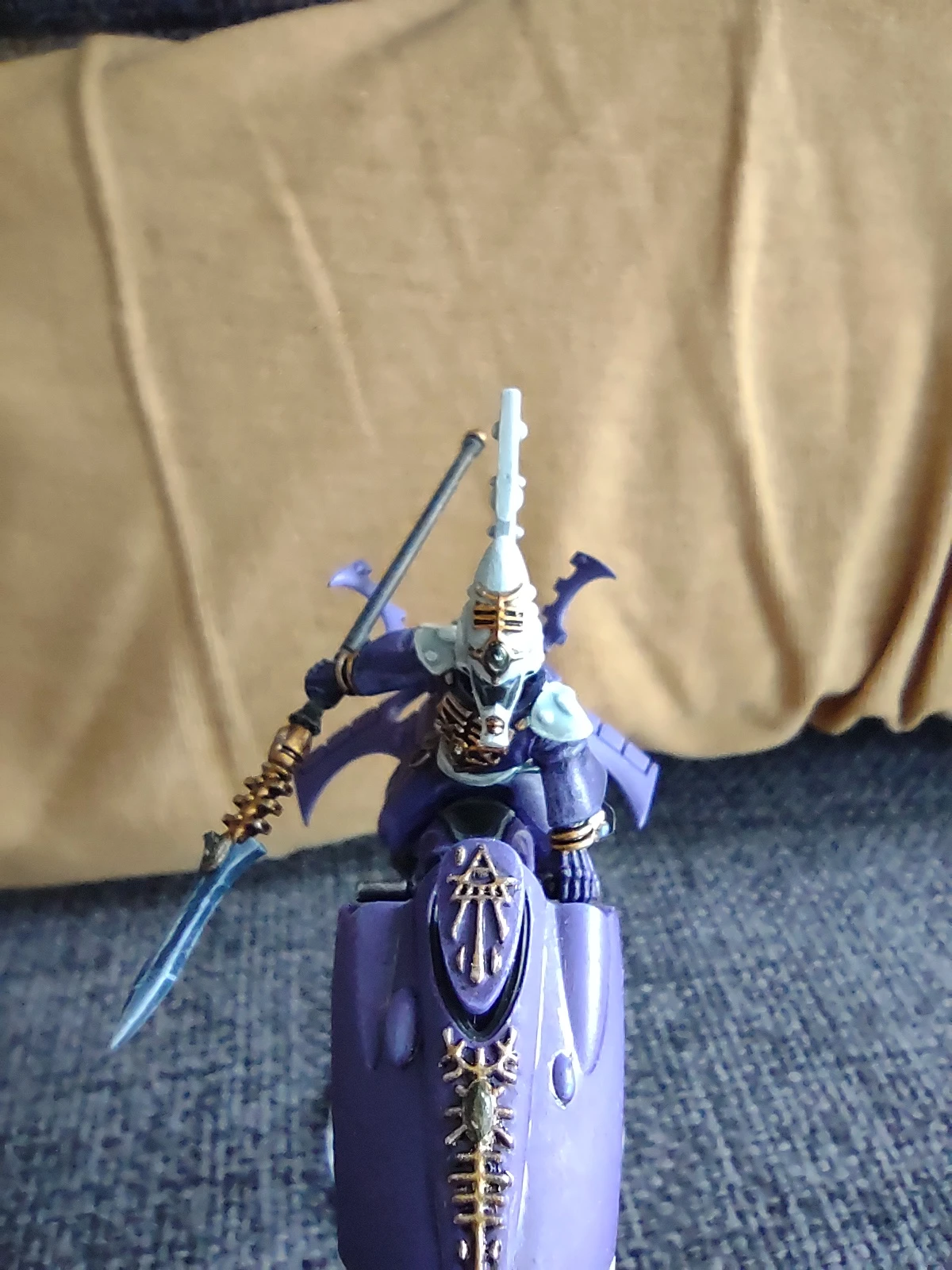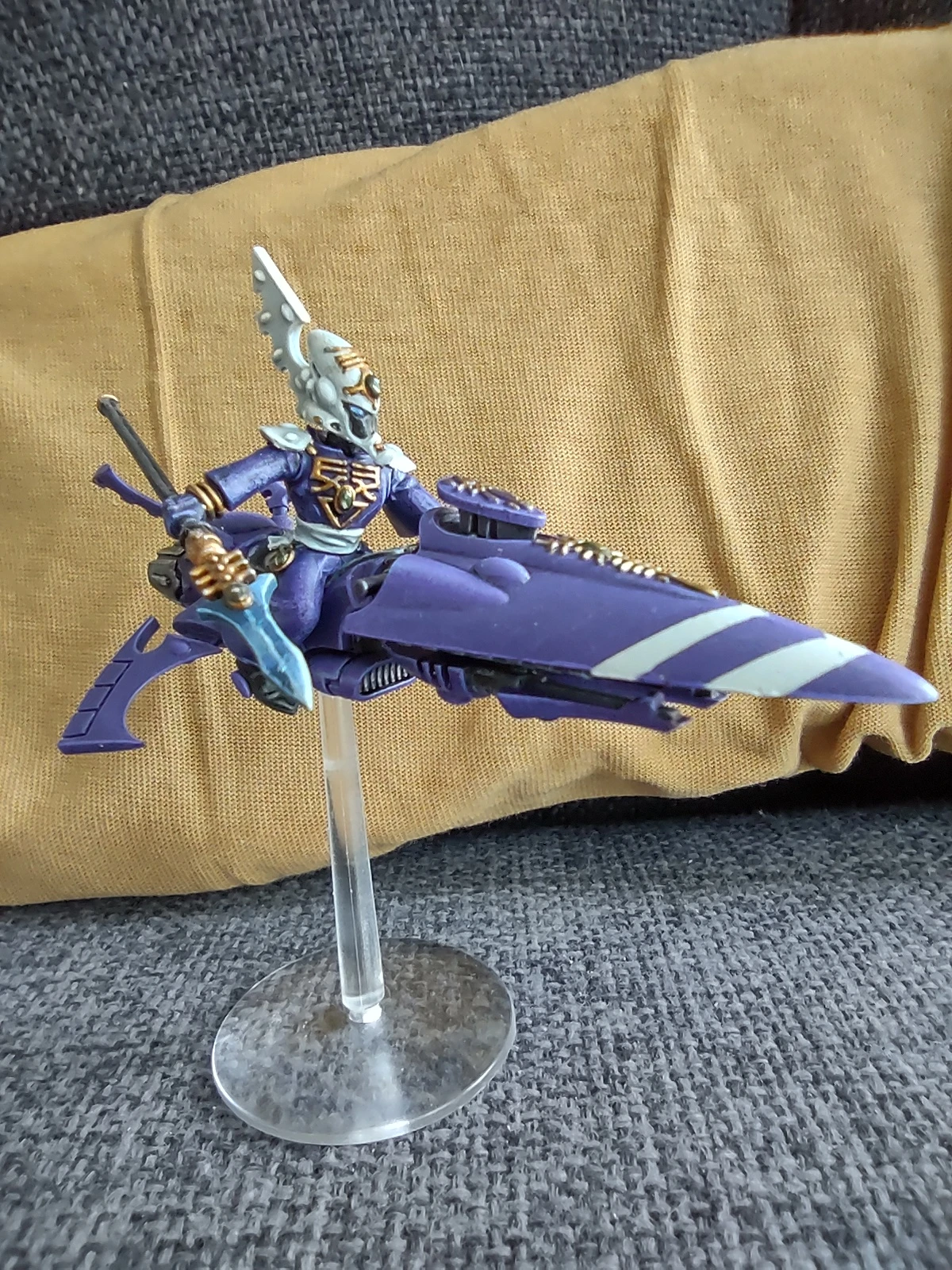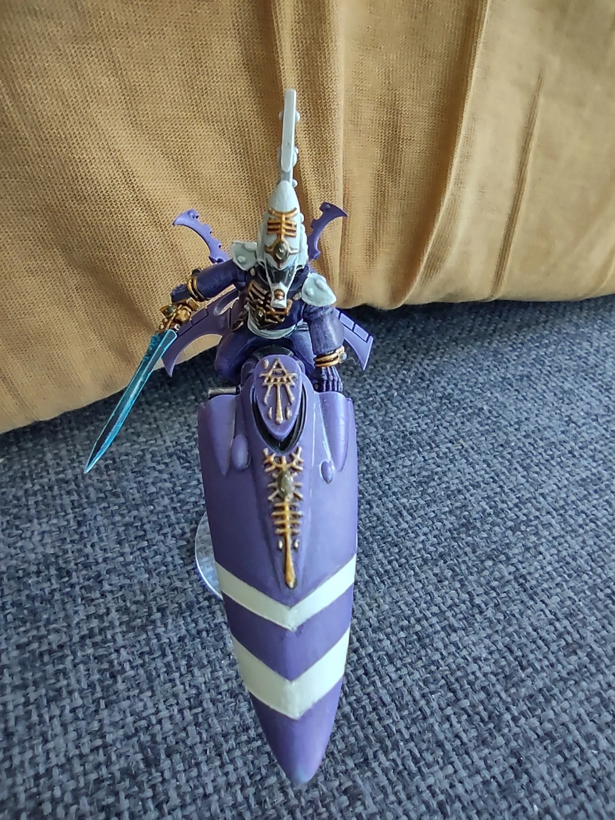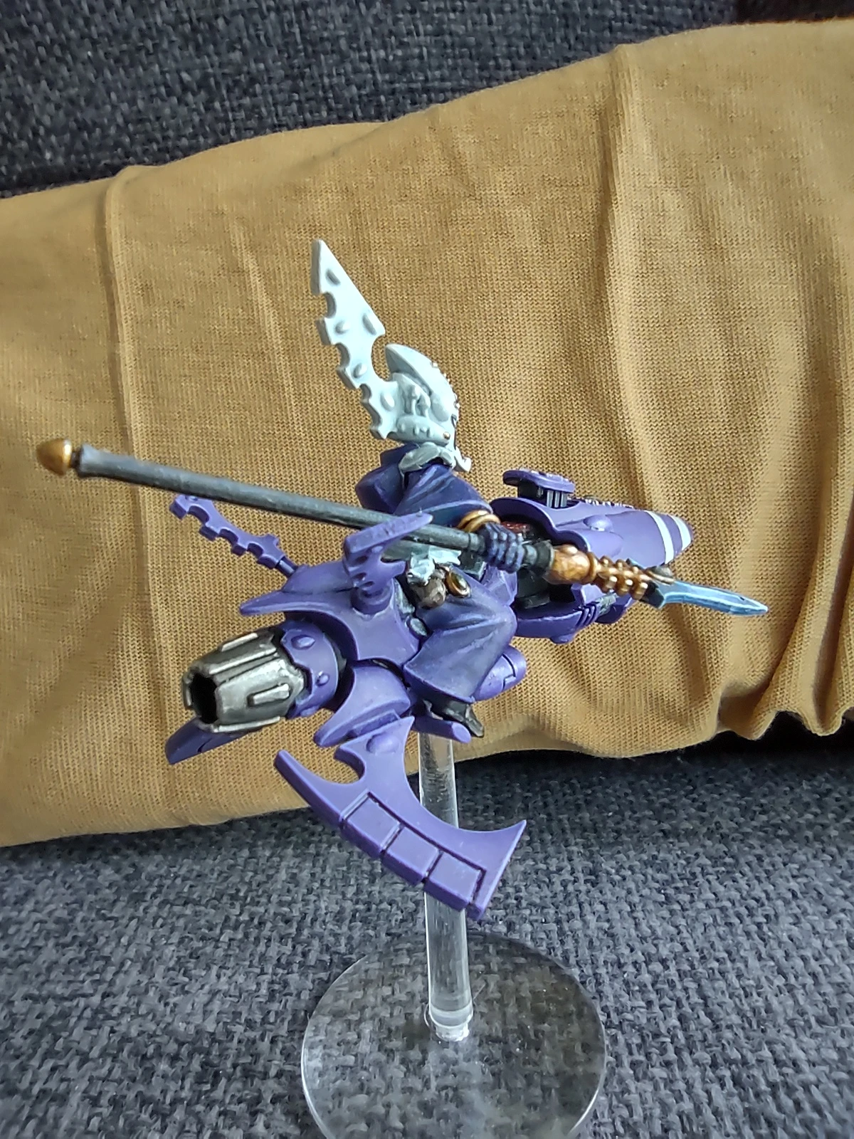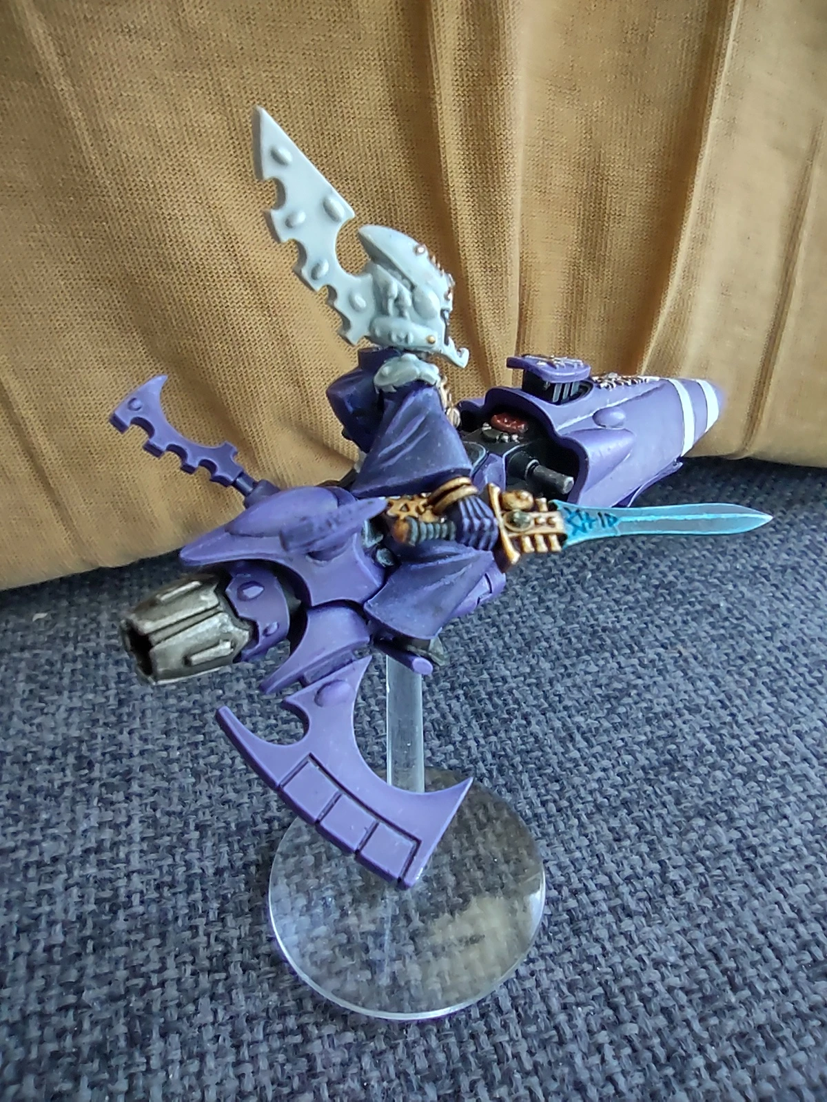В прошедшем месяце скорость покраса, увы, окончательно вернулась к стандартной для меня "4 фигурки в месяц". И первой я закончил начатого еще в предыдущем месяце Видящего на джетбайке в цветах крафтворлда Крударах из Rogue Trader. Сама фигурка стала скорее экспериментом, в первую очередь в плане магнетизации (планировалась возможность менять как голову, так и руку с оружием, но во вторую голову по итогу вставил магнит вверх ногами, так что пришлось ограничиться сменной рукой, ибо выковыривать и переставлять его было лень). Также немного попрактиковался в эффекте синих энергетических клинков в двух разных вариантах (копье и меч).