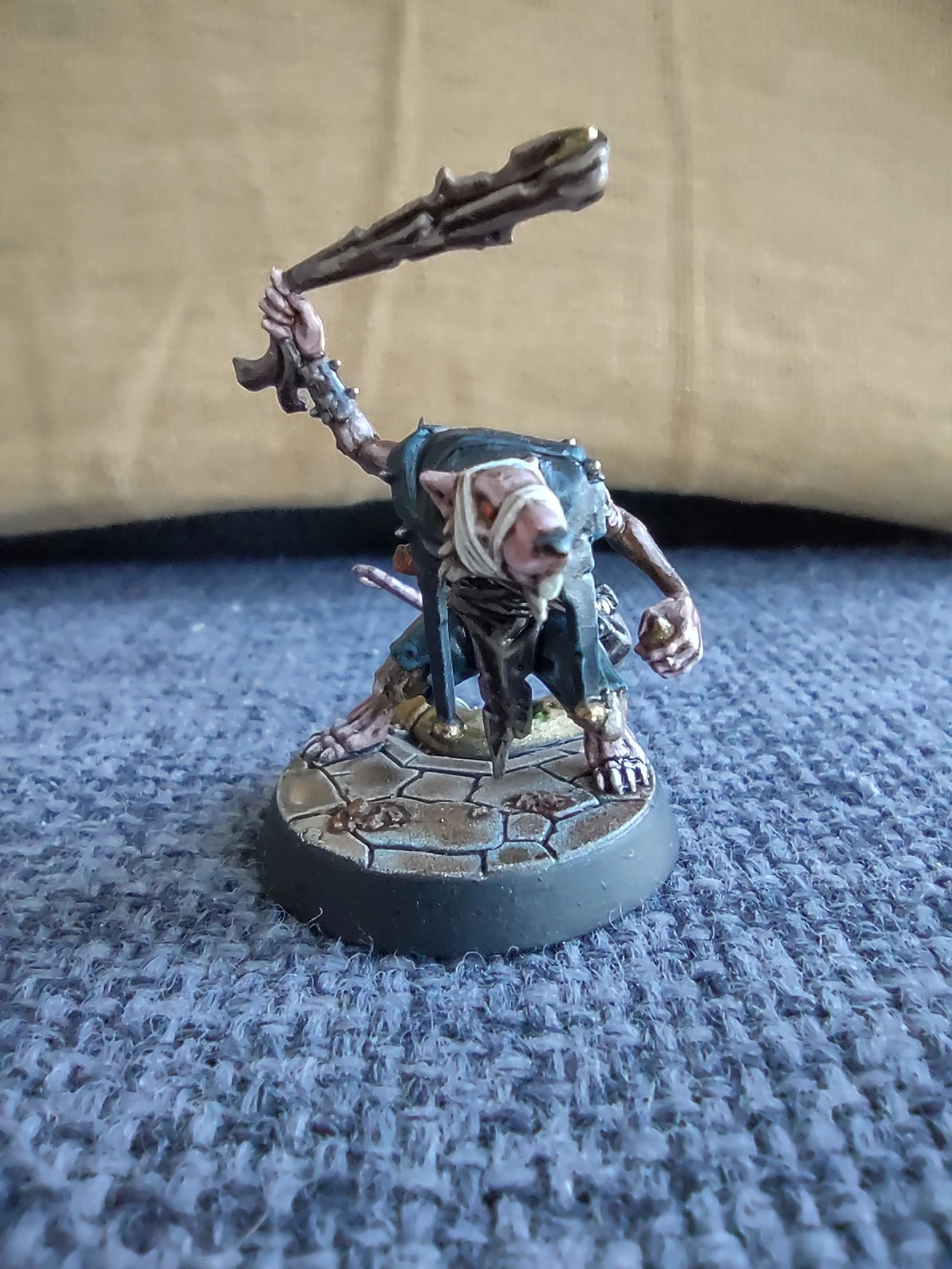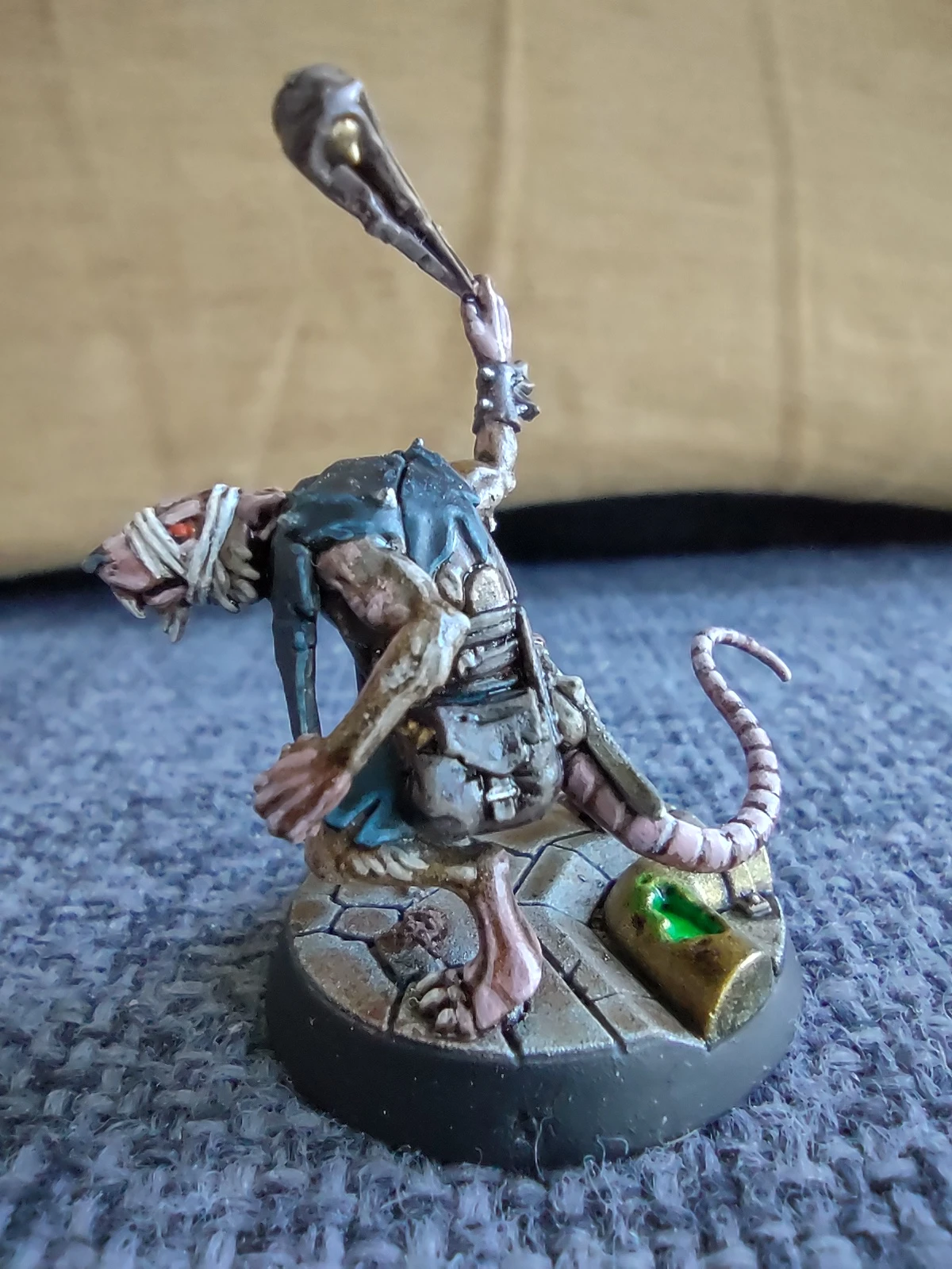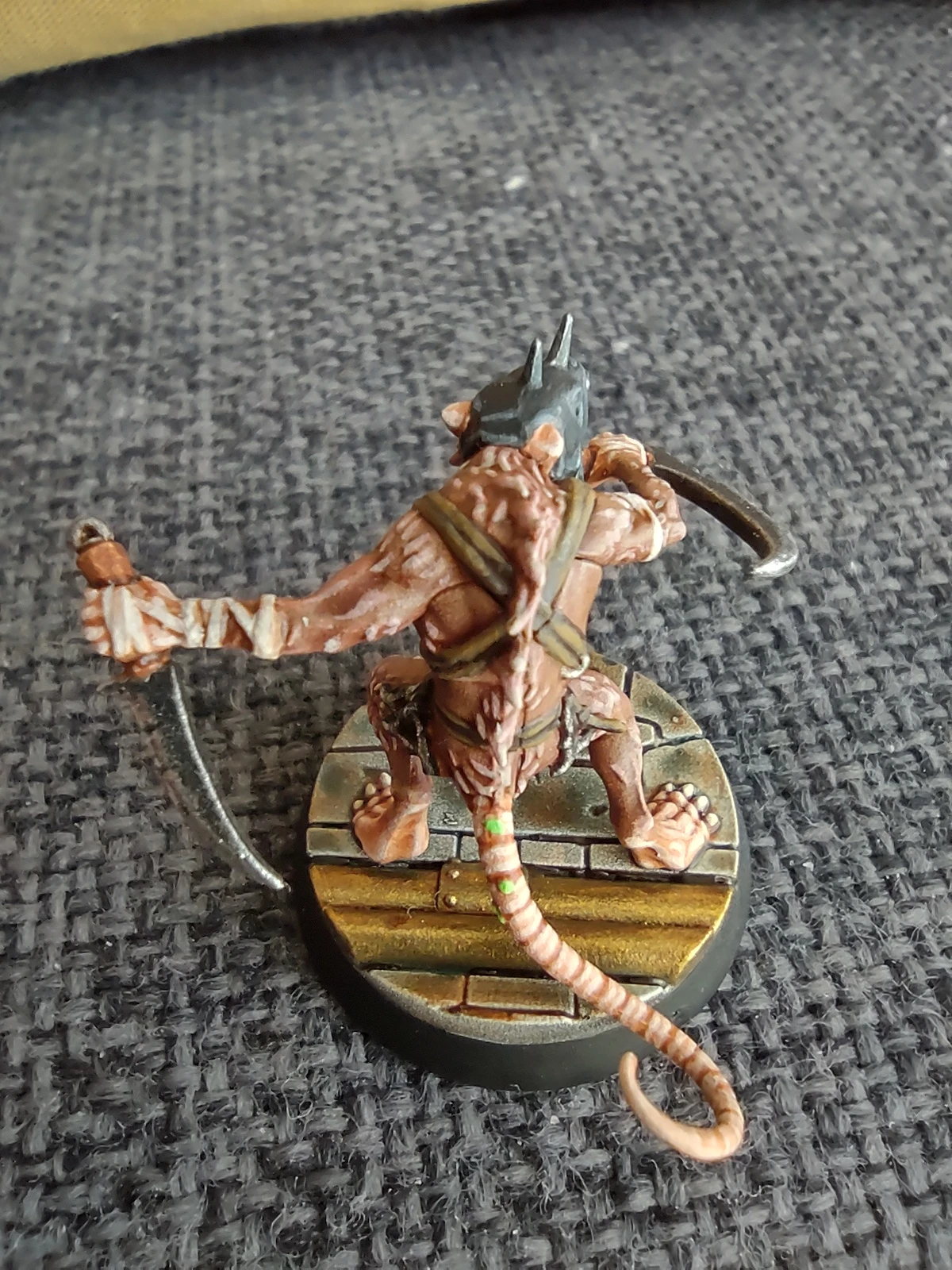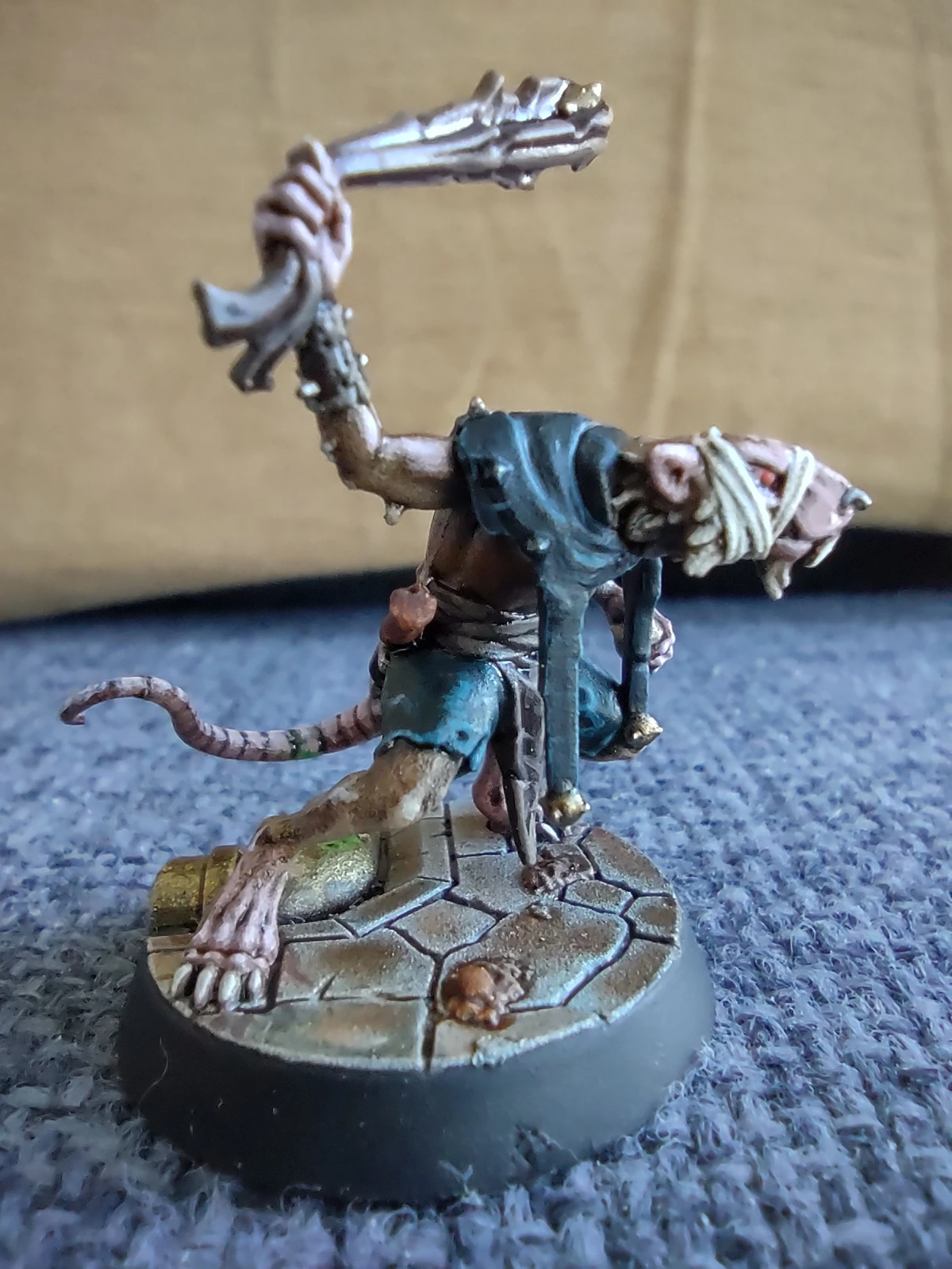 Под конец месяца решил продолжить с фурри-тематикой и начал покрас давно лежавшей у меня WHU-шной варбанды Skittershank's Clawpack. Первым для покраса выбрал мелкого крысюка с пращой. Увы, итоговые цвета шерсти и кожи вышли не совсем такими, как я предполагал, но в общем и целом результат получился ИМХО не самым плохим.