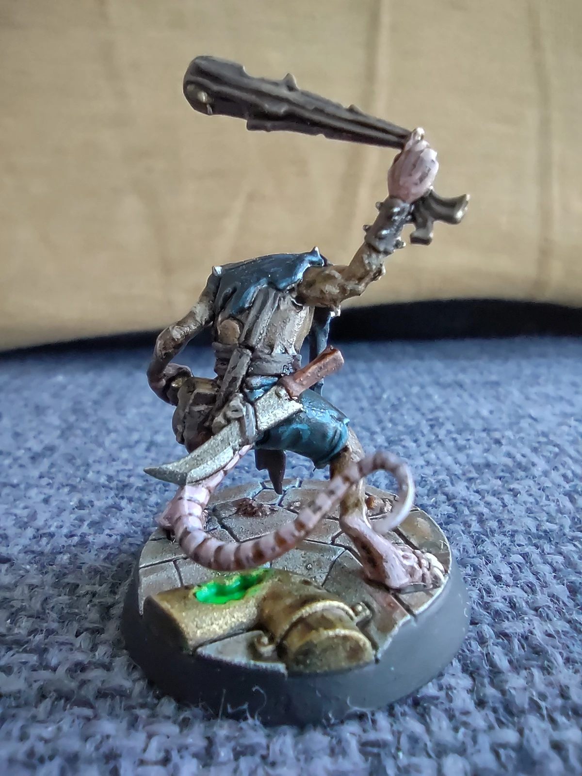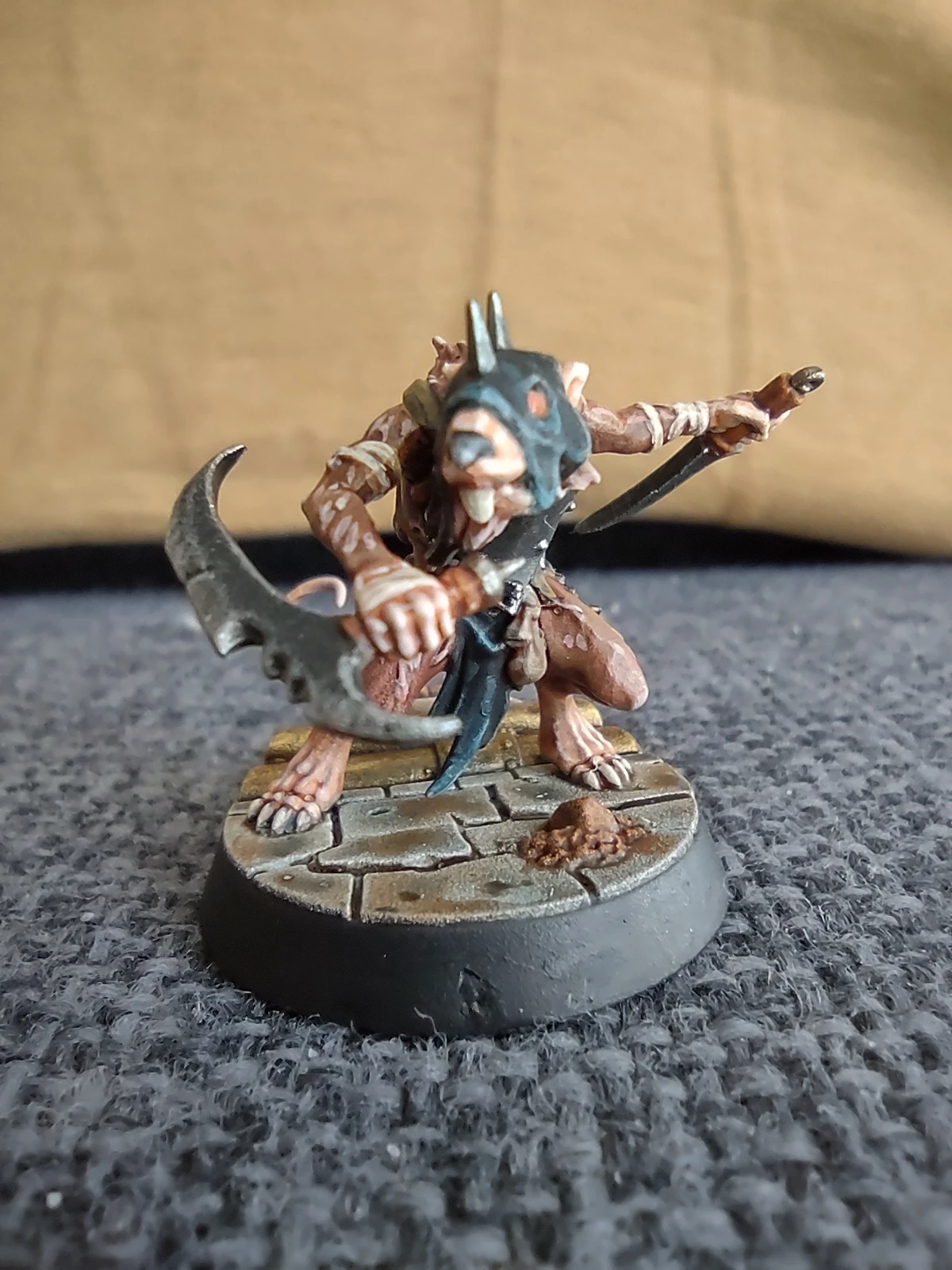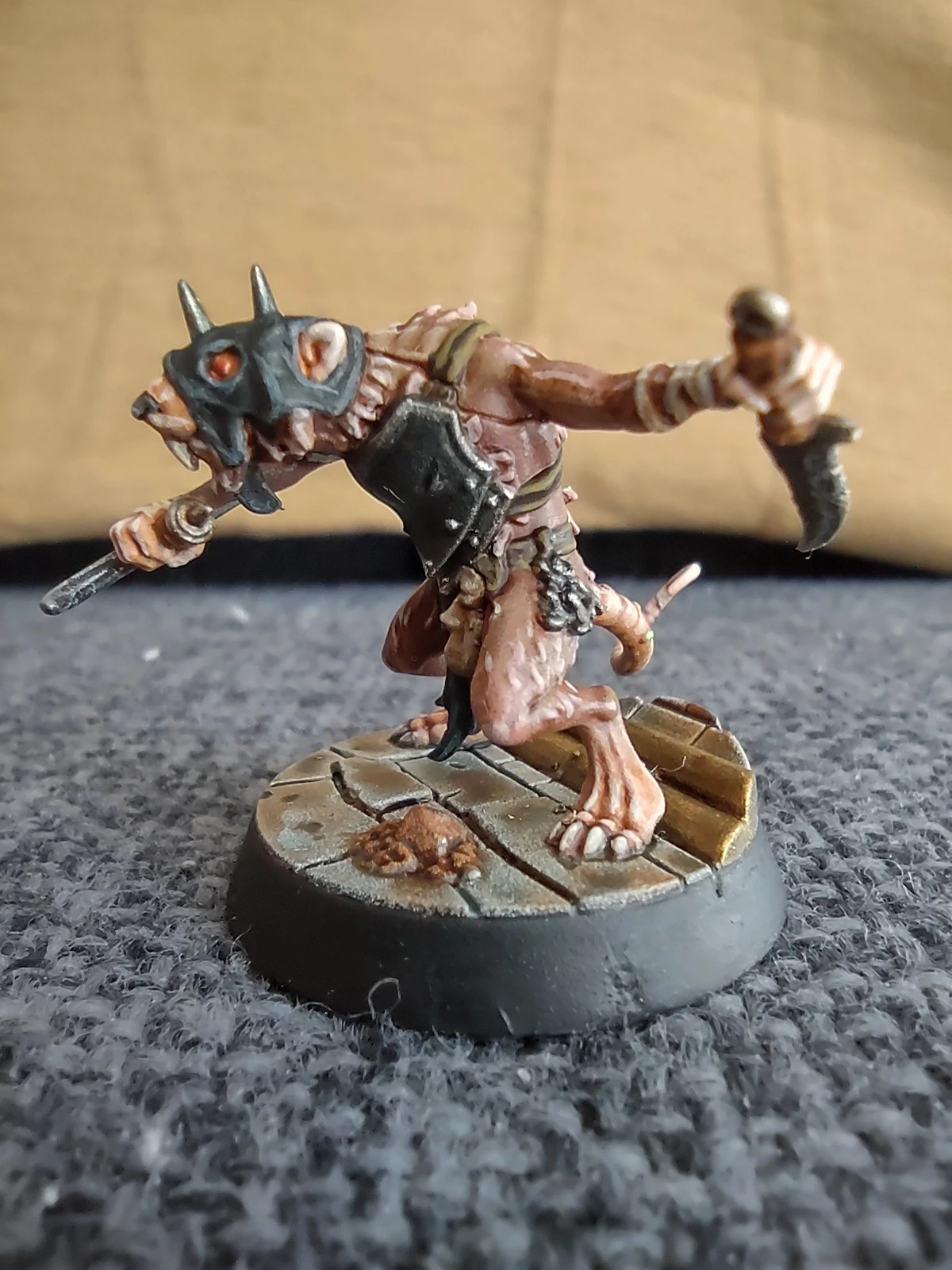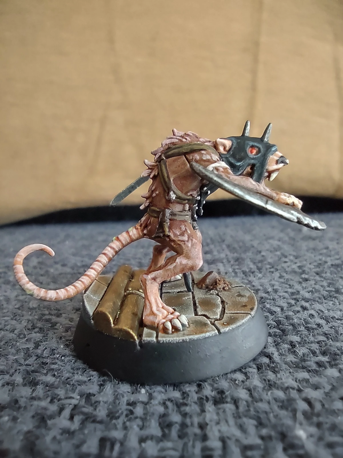 Под конец месяца решил продолжить с фурри-тематикой и начал покрас давно лежавшей у меня WHU-шной варбанды Skittershank's Clawpack. Первым для покраса выбрал мелкого крысюка с пращой. Увы, итоговые цвета шерсти и кожи вышли не совсем такими, как я предполагал, но в общем и целом результат получился ИМХО не самым плохим.