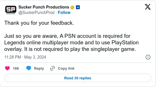 Helldivers 2 снята с продажи в Steam аж в 177 странах, и у коммьюнити-менеджеров внутренних студий Sony прибавилось работы. В частности, отметилась Sucker Punch, сообщившая в сети X, что для игры в Ghost of Tsushima PSN-аккаунт не нужен.