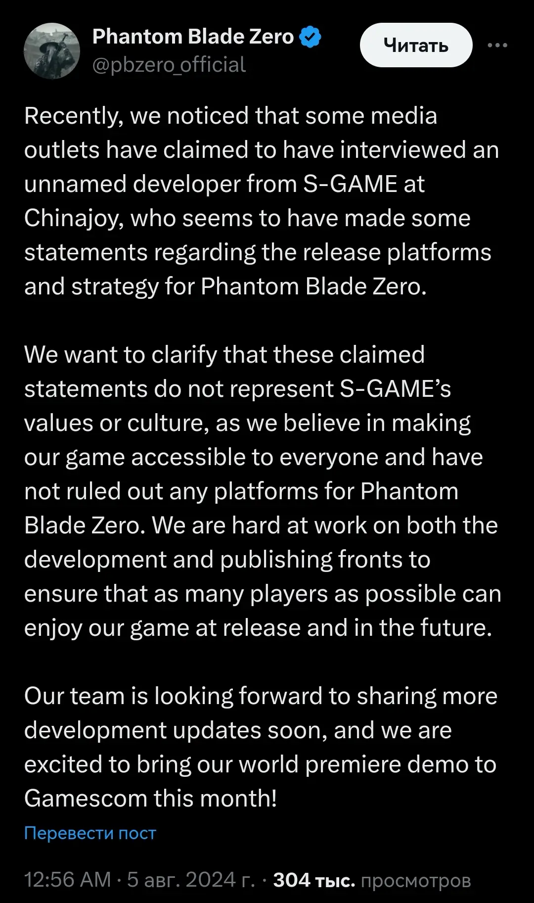Мы хотим пояснить, что эти заявления не отражают ценности или культуру S-GAME, поскольку мы верим в то, что наша игра доступна для всех, и не исключаем никаких платформ для Phantom Blade Zero. Мы усердно работаем как на фронтах разработки, так и на фронтах публикации, чтобы как можно больше игроков могли наслаждаться нашей игрой после релиза и в будущем.