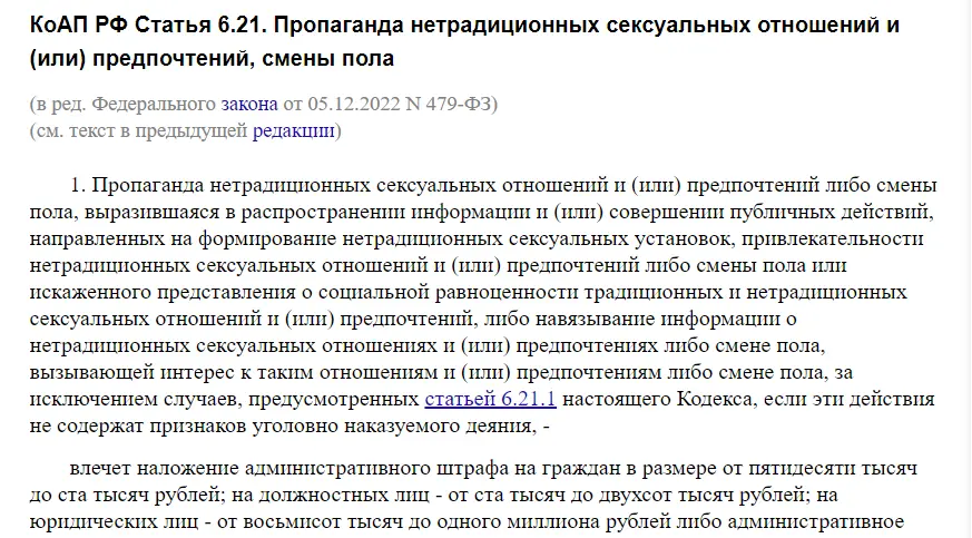 Пока что это административная статья, не уголовная. Каковы перспективы законодательного преображения такого правоотношения, обсуждать мы здесь не будем. Что нам здесь важно — под пропагандой в данной статье понимается распространение информации. А уж что касается объективной стороны — "формирования нетрадиционных сексуальных установок" и прочего — у этих туманных терминов столь широкое применение, что вы и помыслить себе не можете. Беря во внимание то, насколько буквально и рьяно в России применяются запретительные нормы — вспомнить пик уголовных дел по статье о возбуждении ненависти или вражды году в 2018-м — нетрудно понять, что высказывания о какой-либо романтической или сексуальной симпатии между лицами мужского пола может, и будет, расцениваться как нарушение данной обскурной статьи.