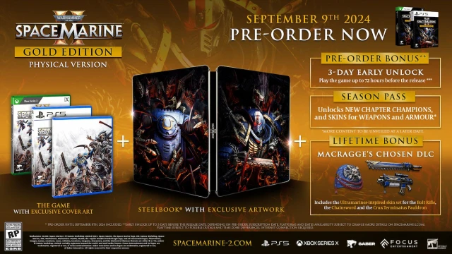 Warhammer 40,000: Space Marine 2 будет доступен на Xbox Series X|S, PlayStation 5 и ПК. Предзаказы редакций Standard, Gold и Collector's Edition доступны для большинства платформ.