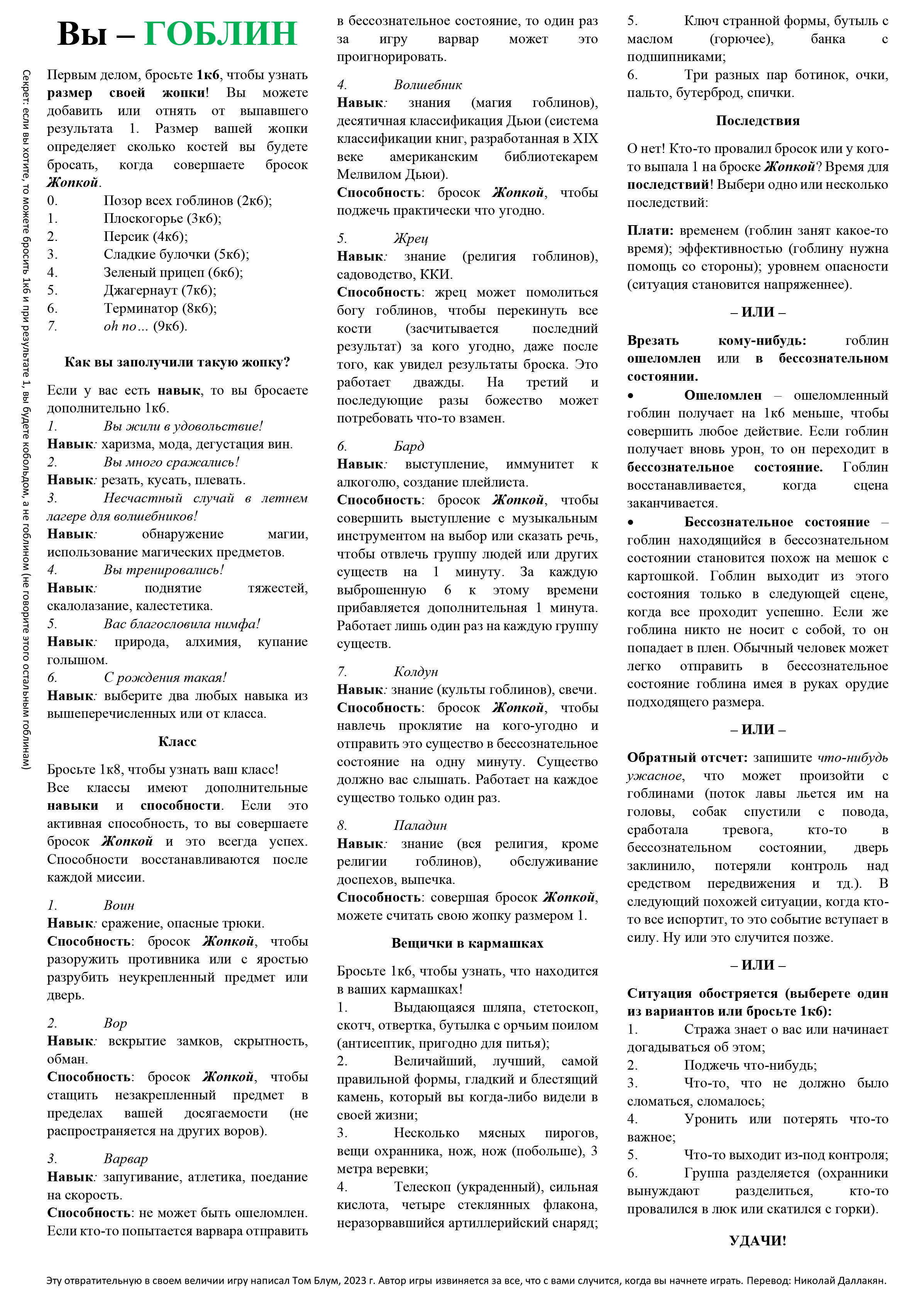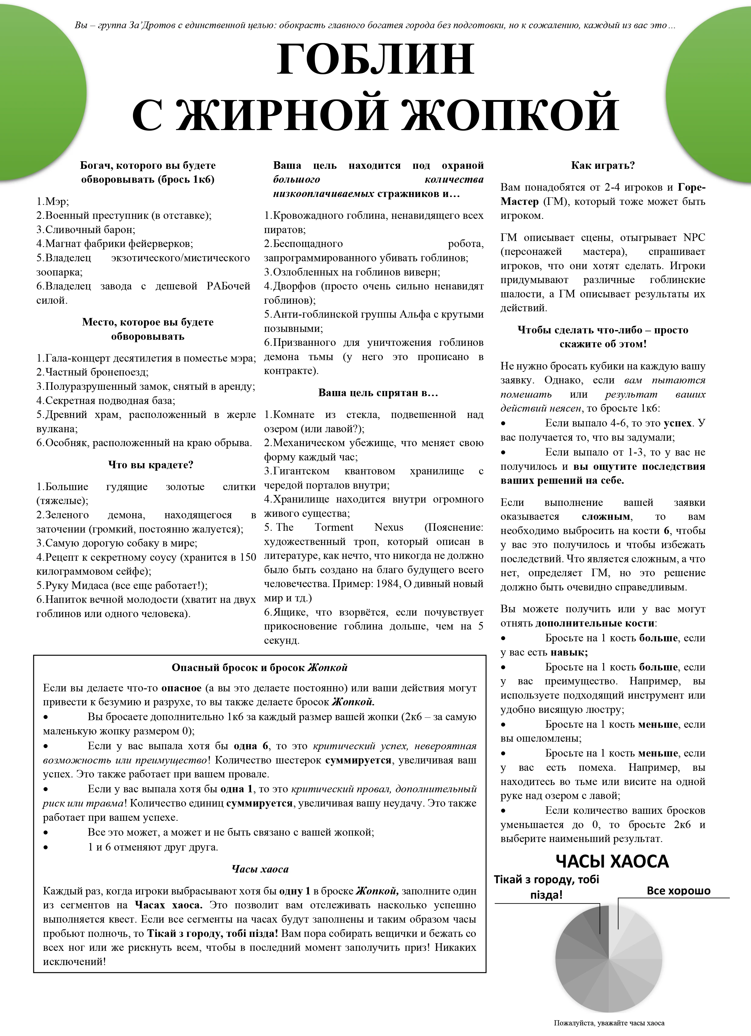 Скажу сразу, что я не профессиональный переводчик, поэтому в тексте вполне себе могут быть ошибки и расхождения с оригиналом, но я постарался максимально передать абсурдность игры. Также не стоит воспринимать игру, как нечто серьезное и имеющее шансы войти в ваше еженедельное расписание настольно-ролевых игр. Но для веселого вечера, полного хаоса и безумия, это то, что вам нужно. Приятной игры!
