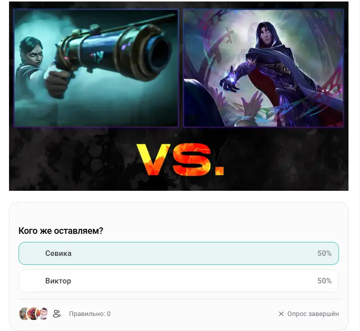 Ха-ха, похоже, судьба сыграла злую шутку, и в нашем дополнительном туре голоса разделились поровну! Что ж, раз так, оба участника продолжат свой бой за звание лучшего, и сегодня мы узнаем, над кем зависнет гильотина.