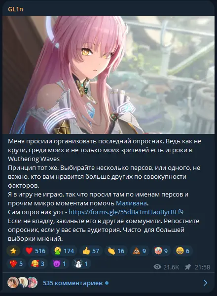 Ну что ж, я ранее сообщал, что небезызвестный в ру гача коммюнити GL1n вновь решил провести опрос по персам гач, в этот раз по вуве. Выборка конечно крайне маленькая, ибо и сам стример не играет в игру, и даже не стал договариваться с крупнейшим ру каналом в телеге по игре, чтобы разместить свой репост. Но за то вы можете быть уверены, что даже ваш голос был важен и возможно решающим)